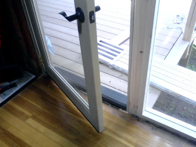 The picture window, and the section of wall beneath it were removed. In it’s place a combination window and door were installed. The deck joins the arrangement in the middle, preserving access to a 4’ tall door just below the window where kayaks are stored under the cabin.