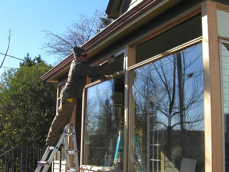 A sunny day in January! Dry cold air and bright sun was often blinding against the east face of the house. Just as often the rain and wind stopped work all together. One high windstorm necessitated an emergency evening trip to secure tarps blowing in the gale.