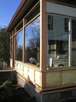 The 1970's foundation for the porch had been built 2" out of line with the existing porch roof. In addition, the posts did not extend all the way to the foundation but instead landed on the windowsills. The resulting out-of-line forces were tearing the two walls apart from each other and dislodging the glass above. All the windowsills and most of the posts had extensive rot from inferior materials and construction details.
