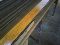 Because of the cold weather, as each board was coated it was set into this rack, with a plastic tent built over it. When the rack was full heaters were set under the tent with the wood and the tent was closed for three days. For the final day the tent was opened in two spots and some circulation was created through it with a fan.