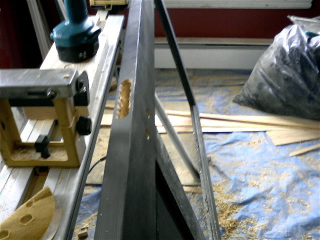 Trimwork in progress. Floor protection was laid down and the interior of the house became a custom trim shop. Each bundle was opened and examined for missing parts. Pieces were mixed and matched as needed, or created from scratch if need be.